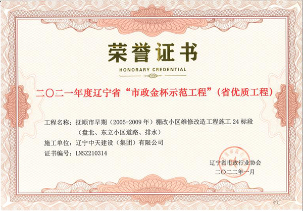企業先后榮獲“全國優秀施工企業”、 “中國AAA級信用企業”、“全國保障性安居工程建設勞動競賽先進單位”、“遼寧省最受尊敬企業”、“遼寧省優秀建筑業企業”、“遼寧省工程建設質量管理優秀企業”、 “遼寧省守合同、重信用企業”、遼寧省“AAA級信用企業”、 “撫順市安全生產先進單位、紅旗單位”、“撫順市安康杯競賽先進集體”等多項殊榮。